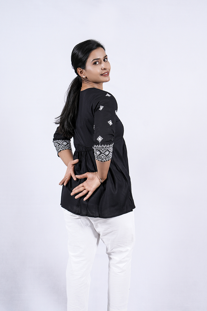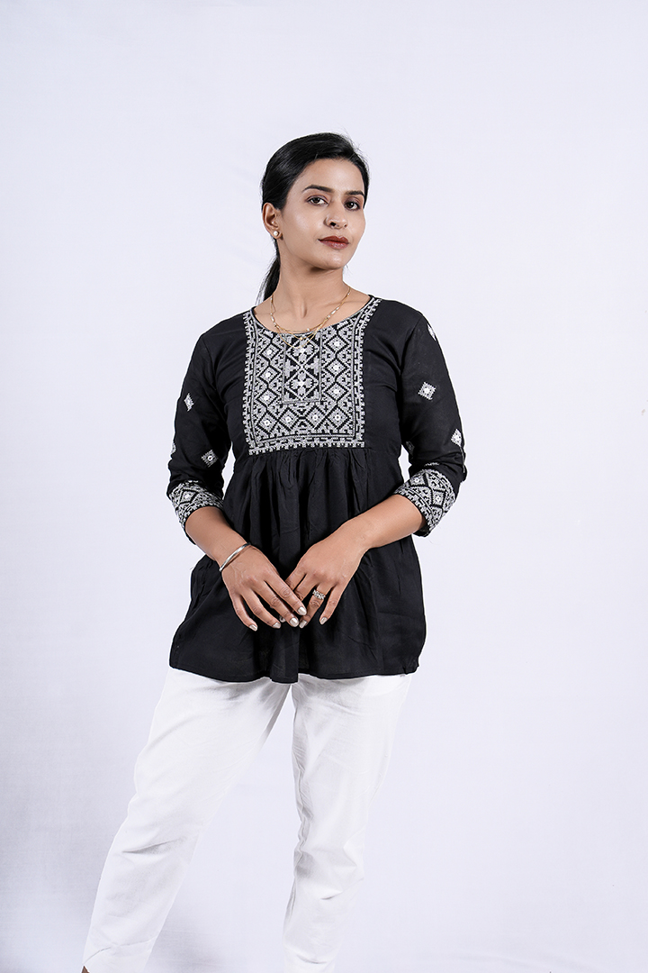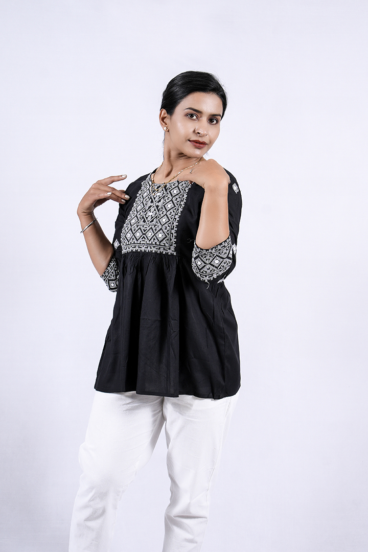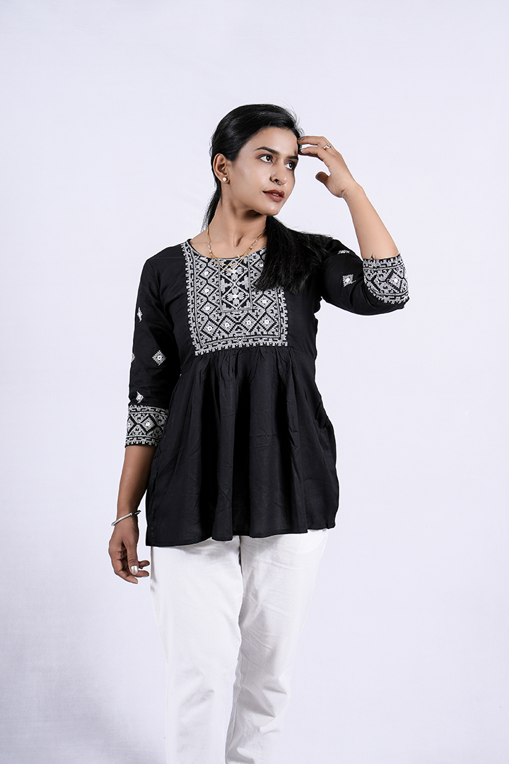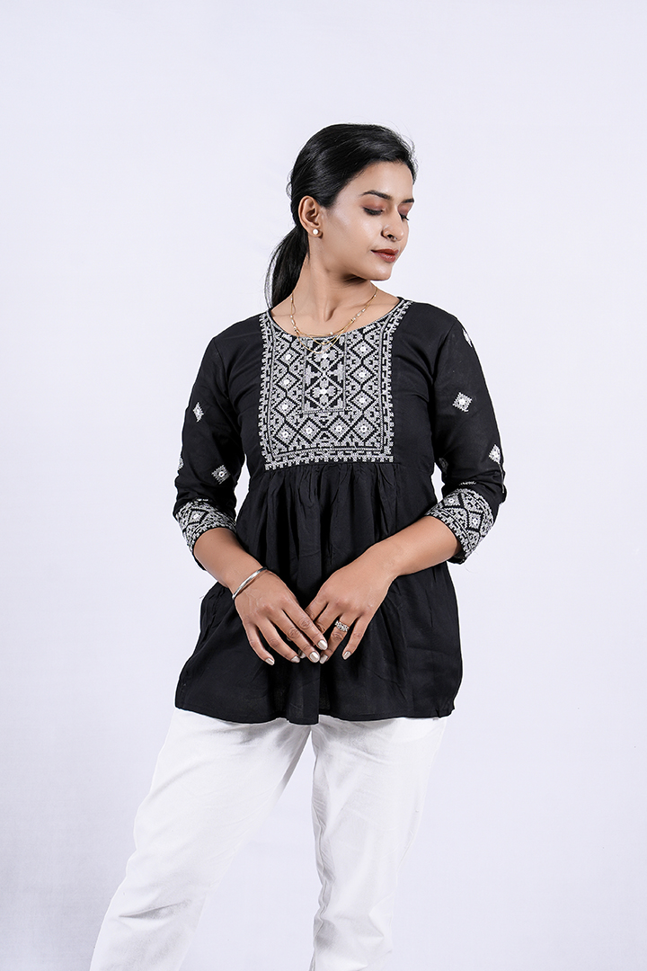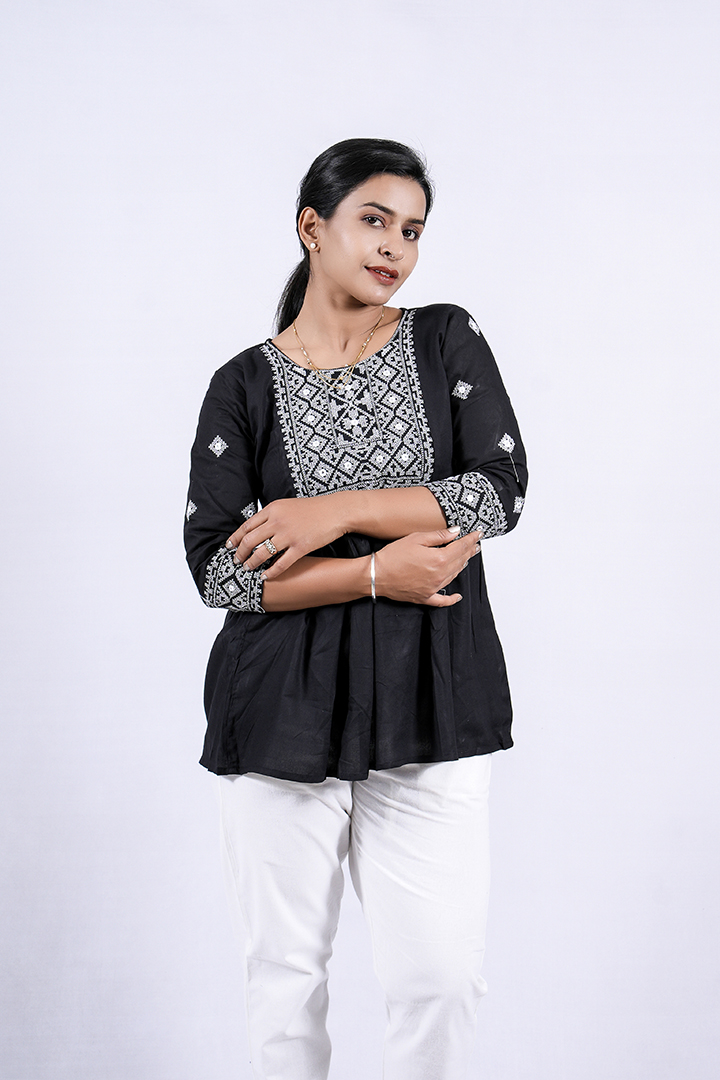 Chikankari Argyle Embroidery Short Kurti (Black)
