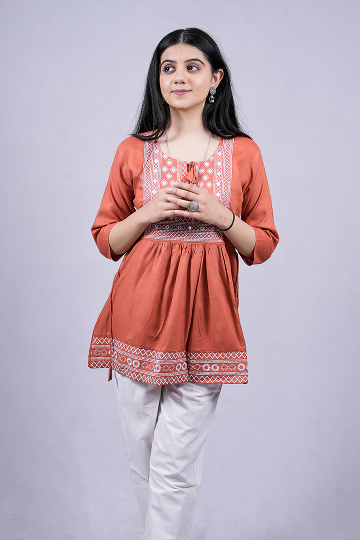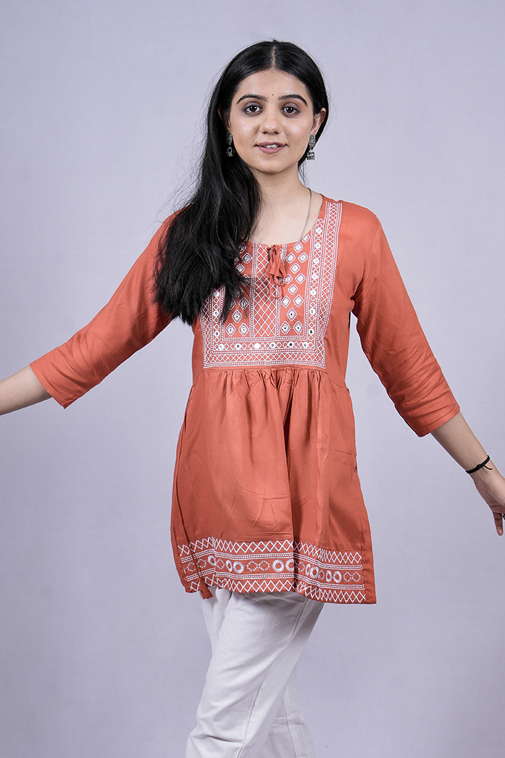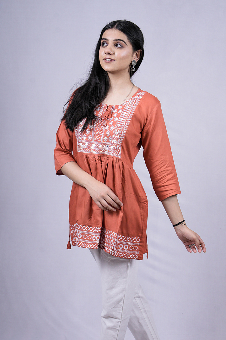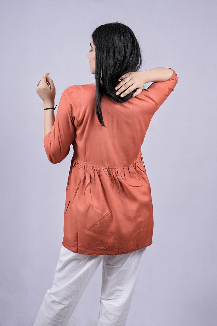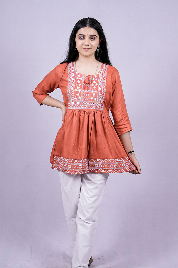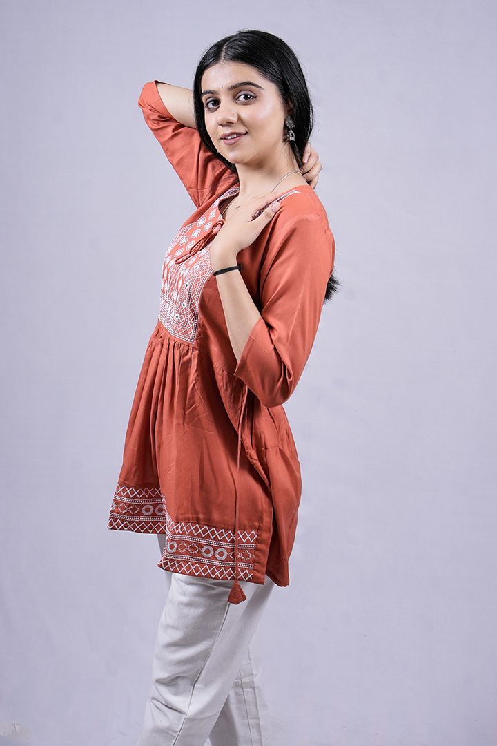 Chikankari Embroidery Short Kurti with Tassels (Dark Peach)