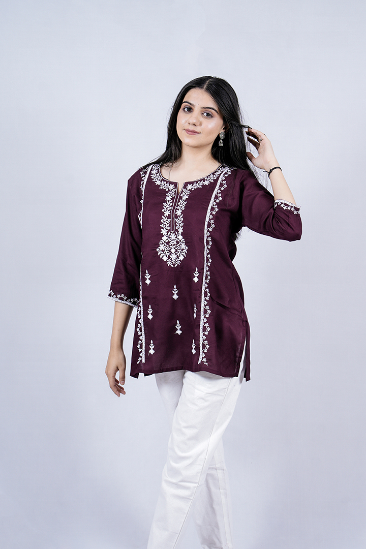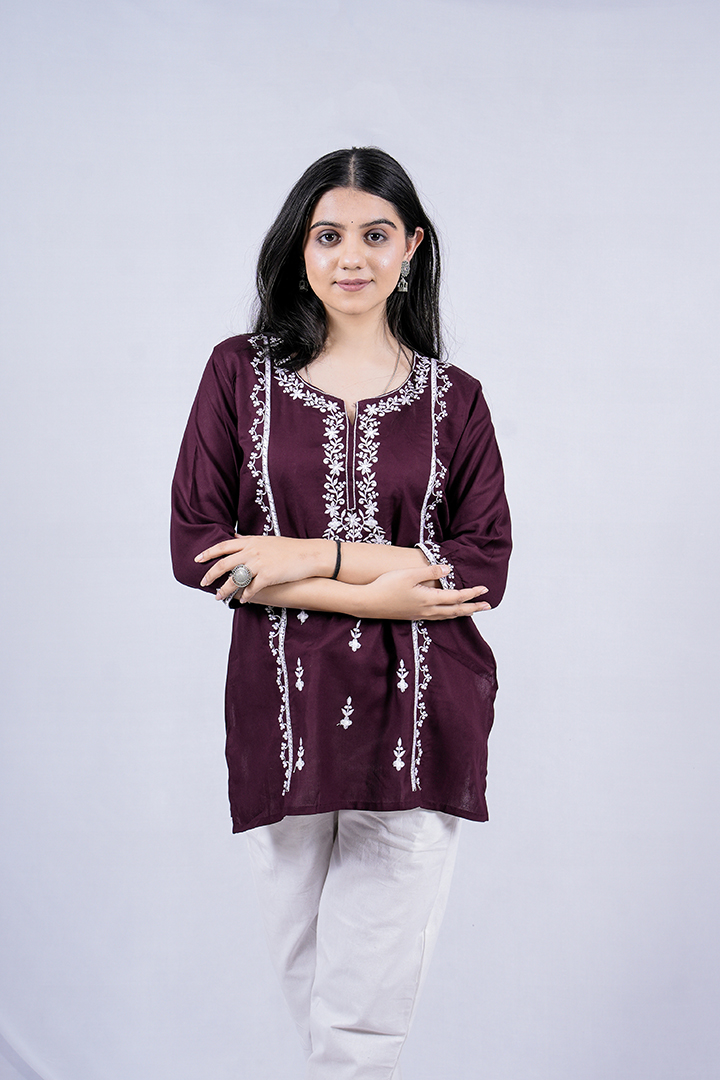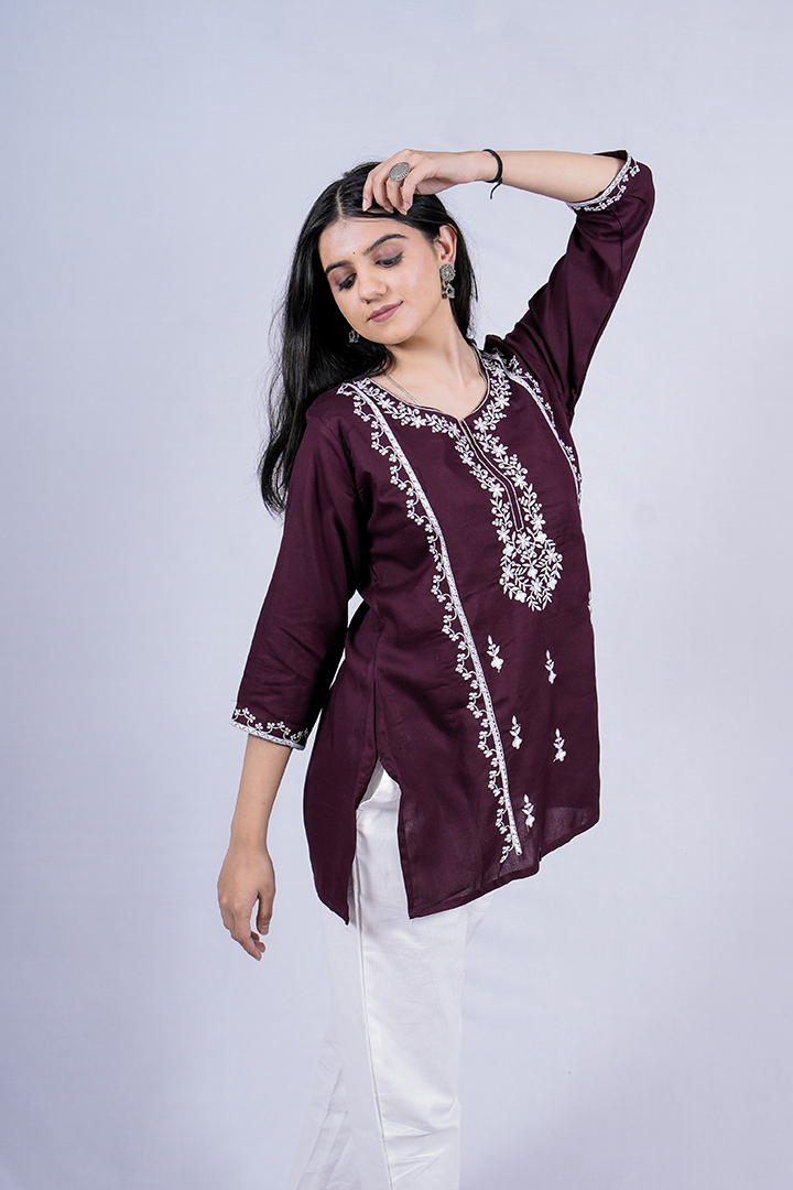 Chikankari Floral Embroidery Short Kurti (Wine)