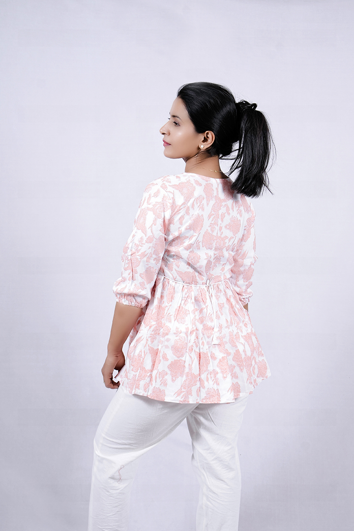 Floral Printed Blend Flared Short Kurti (Sea Pink)